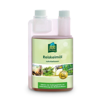 Reiskeimöl ist eine bewährte Ergänzung zur Unterstützung des Muskelaufbaus während des Trainings. Dieses Öl enthält den rein pflanzlichen Wirkstoff Gamma-Oryzanol, welchem ein muskelaufbauender Effekt nachgesagt wird. In der Pferdefütterung hat sich dieses Öl zur Förderung des Muskelaufbaus in der Trainingsphase sehr bewährt. Reiskeimöl kann einfach über das Kraftfutter gegeben werden und ist somit ideal in die Ernährung des Sportpferdes zu integrieren.